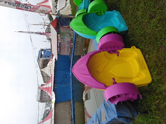 The image captures an outdoor temporary amusement or market area in Ciwalen, Indonesia, under an overcast sky. In the immediate foreground, green grass is visible. Two colorful, plastic, paddle-wheel boats are resting on the grass; one is primarily yellow with purple external paddle-wheel components, and the other is blue with green external components. Directly behind these boats, a temporary, rectangular pool-like structure, lined with a blue tarp, contains murky water. Beyond this structure, multiple temporary market stalls or tents are erected, some featuring red and white striped peaks. A smaller booth with a red roof is also present. Several tall, white banners with black and red text, along with strings of overhead decorative lights, are visible. In the background, various buildings are present, including a multi-story structure with a blue facade. No individuals are visible within the scene.