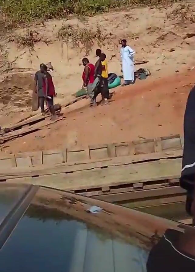 several people standing on a red dirt bank next to a river or body of water. The camera appears to be located on a boat. Some of the people are dressed in colorful clothing, while one person is wearing a white robe. There is vegetation on the bank behind them. Several of the people are moving around and talking. There is also a structure made of wood on the bank, possibly a makeshift dock or walkway.