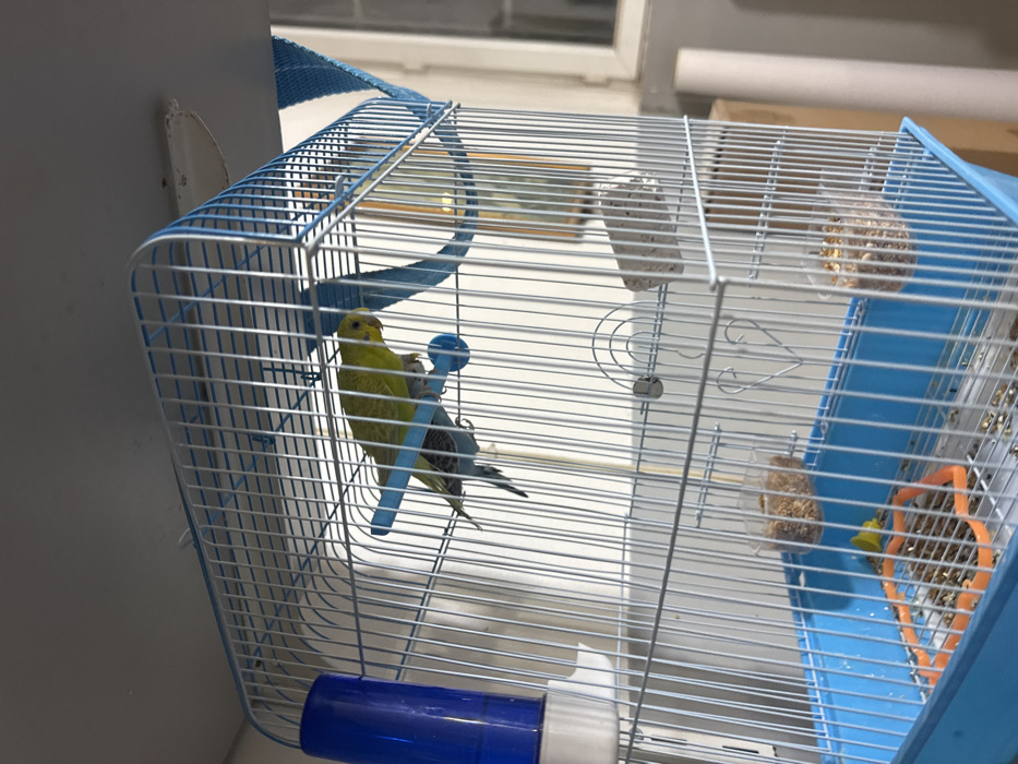 - "A blue birdcage houses two budgies, one yellow and one blue" by FM-paxGn1, licensed under CC BY 4.0