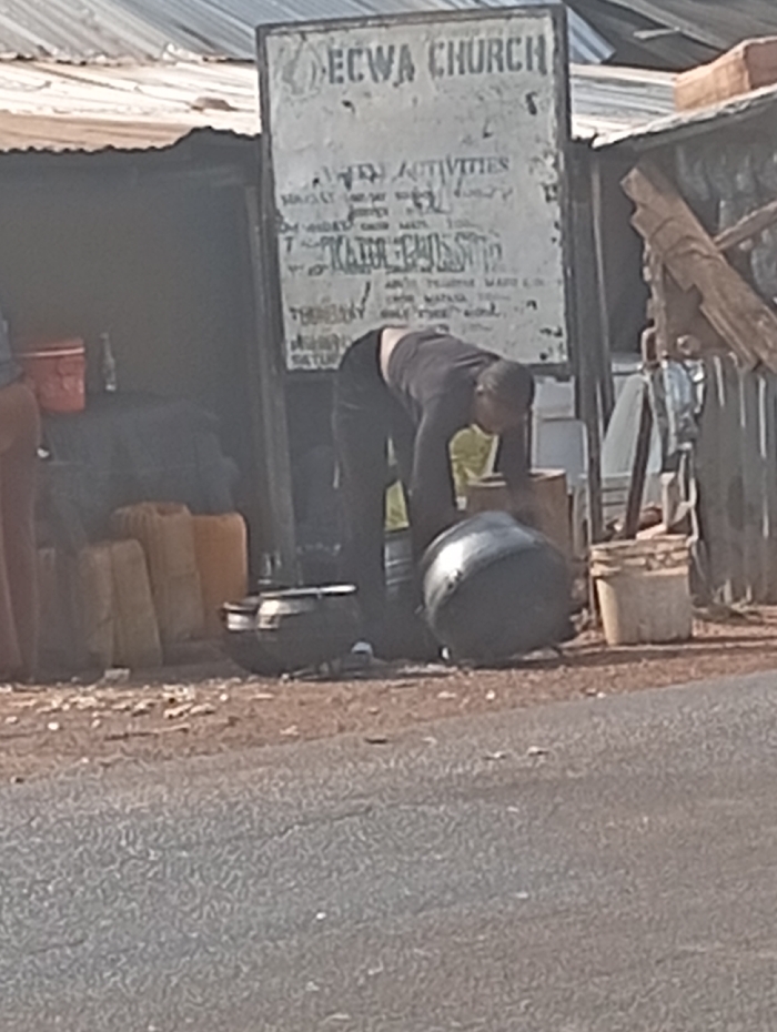 The scene depicts an outdoor area in Agunu, Nigeria, adjacent to an ECWA Church, indicated by a prominent white sign with "ECWA CHURCH" inscribed at its top. The image is captured during daylight hours. In the mid-ground, a dark-skinned individual, wearing a dark long-sleeved shirt and dark trousers, is bent forward, attending to or manipulating large, dark, rounded pots on the ground. One pot is upright, while another lies tilted on its side to the right of the person. To the left of the individual, several reddish-brown jerrycans or similar containers are stacked. The ECWA Church sign, with additional faded text below "ACTIVITIES," stands behind the person. Various rudimentary structures with corrugated metal roofs are visible in the background. To the far right, a white bucket and other indistinct items are present, along with what appears to be part of a bicycle frame. The immediate foreground consists of an asphalt road surface, separating the viewer from the scene. The ground adjacent to the road is dirt, with scattered debris.