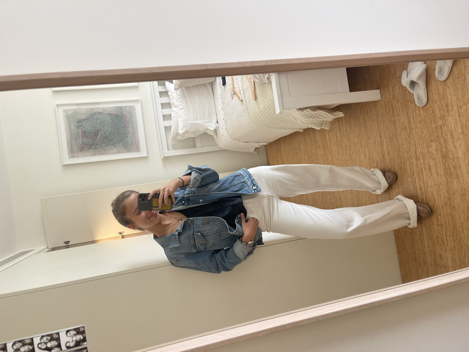 A full-length mirror selfie depicts a young adult female in a bedroom located in Matosinhos, Portugal. The female, with her hair pulled back, wears a light blue denim jacket over a dark V-neck top, white wide-leg trousers cuffed at the ankles, and light brown loafer-style shoes. She holds a smartphone with a yellow case in her right hand, positioned to capture the image, and her left hand is partially in her pocket. She exhibits a slight smile. The background features a white bed with a headboard and layered white and beige bedding, a white wooden bench at the foot of the bed, and a framed abstract artwork with green and pink tones hanging above the bed. To the left, a white wardrobe door is slightly ajar, and a vertical strip of four black and white photo booth images is affixed to the wall. The room features light-colored walls and light brown wood-effect flooring. A pair of light-colored fuzzy slippers rests on the floor near the right edge of the mirror.