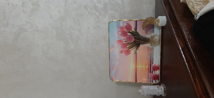 A rectangular piece of art with a golden frame is attached to a light gray wall. The artwork features a bouquet of pink tulips in a vase against a backdrop of a sunset with orange and pink hues. A white plastic object with a gold decorative piece is affixed above the frame. Below the artwork, there is a glass container filled with white granules. The artwork is placed near a brown wooden structure.