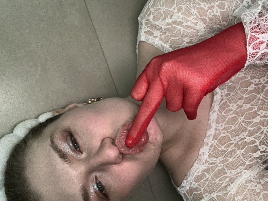 A person lies on a gray surface, angled. The individual has fair skin, light eyes with glittery makeup, and is adorned with a white lace garment. A red-gloved hand presses a finger against the person's mouth, distorting the lips. An ornate hair accessory is visible near the ear. The lighting creates soft shadows, accentuating the textures of the lace and the glove's sheer material.
