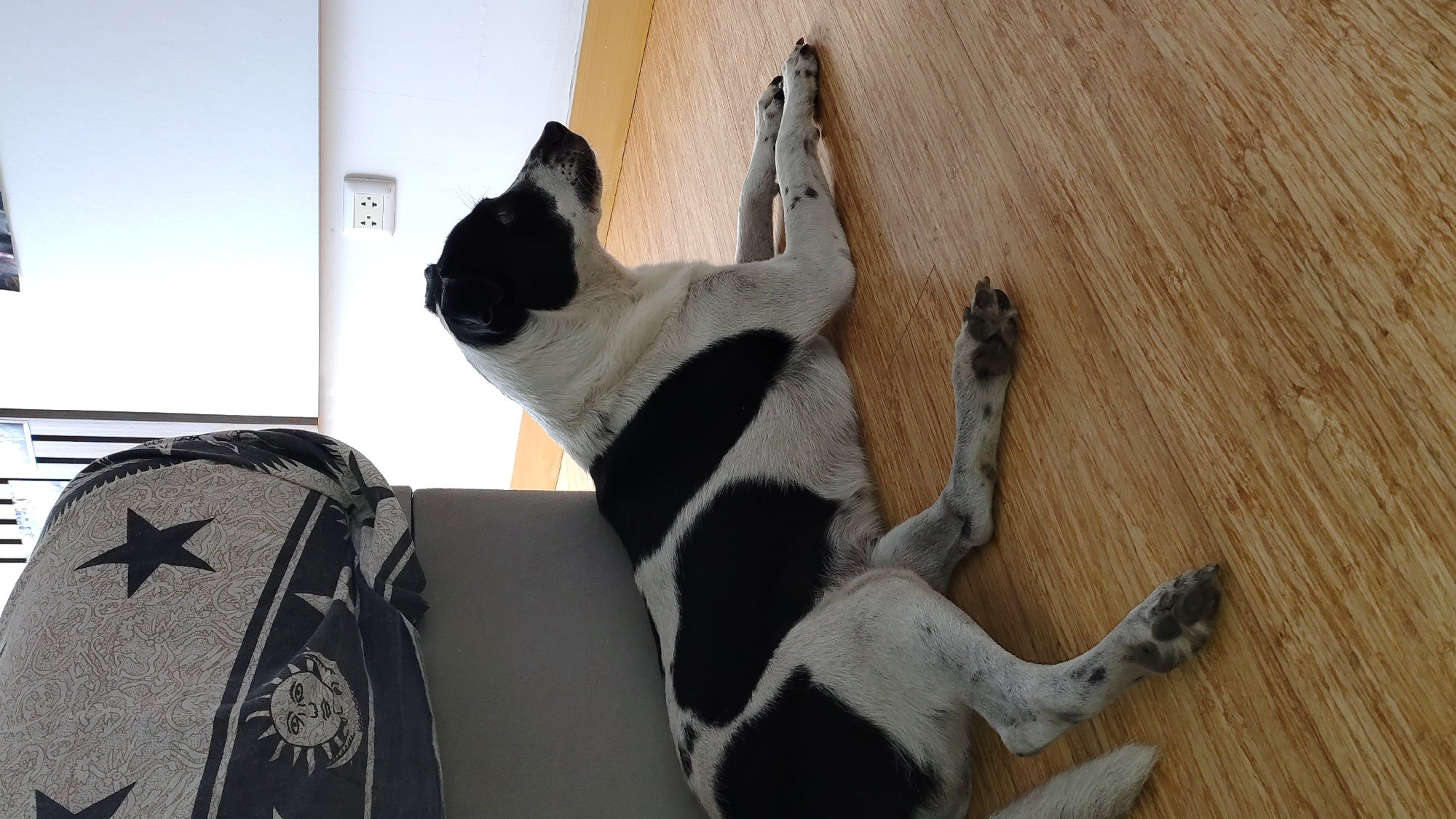 A black-and-white dog lies on a gray couch in a room with light-colored wooden floors, and the photo was taken indoors at Chorrillos, Peru. The dog's body is positioned on the couch, with its front legs stretched straight up against the wooden floor. A patterned pillow rests on the left side of the couch. An electrical outlet is visible on the wall behind the couch.