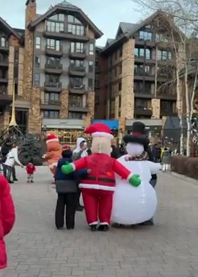 n outdoor scene in what appears to be a plaza or walkway in a town or resort area. Several people are walking around. The background includes large buildings with multiple stories and balconies. The architecture suggests a mountain resort or upscale town. In the foreground, there are three inflatable Christmas characters: a gingerbread man, Santa Claus, and a snowman. People, including children, are interacting with the inflatable figures, some putting their arms around them. The sky is overcast and the ground is paved with bricks or cobblestones. A person in a red jacket is standing and facing the camera. There are bare trees scattered around the area, suggesting winter or late fall.