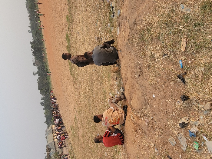 A sparsely attended soccer match takes place on a dry, dusty field. A small crowd watches the game from the sidelines. Closer to the camera, several people are seen sitting or standing, seemingly apart from the larger group. Litter and debris are scattered on the ground. The atmosphere appears casual and unorganized.