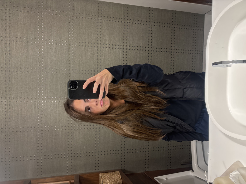 A woman with long, light-brown hair takes a mirror selfie. She wears a dark, possibly black, jacket and top. The background is a textured wall with a pattern of small, possibly metallic, dots in a grid. To the right, a white sink and faucet are visible. Below, a wooden shelf with a woven basket can be seen.