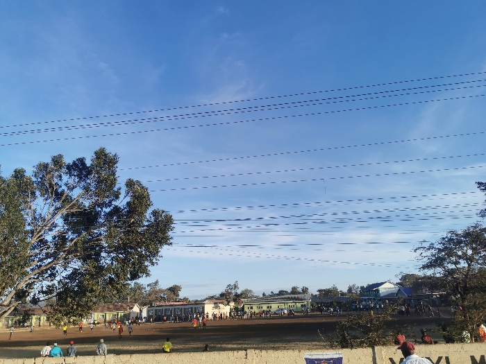 An outdoor scene in Gatuanyaga ward, Kenya, depicts a wide, open dirt field under a clear blue sky, traversed by multiple dark, horizontal dashed lines resembling power lines or communication cables. In the immediate foreground, a light-colored concrete wall extends horizontally. Behind this wall, at least six individuals are observed; one on the far right wears a red cap. The midground features the expansive field, where approximately 40 to 50 individuals are present. Many are grouped in the center, some wearing colored tops (yellow, red, dark), suggesting participation in or observation of a sporting event, likely football. A large, densely foliated tree occupies the left foreground, partially obscuring the field and background structures. Another smaller tree is visible on the right. In the background, a row of single-story buildings with varied colored roofs (light green, white, blue) stands behind the field, consistent with school or institutional architecture, flanked by additional trees and vegetation. The scene is illuminated by bright daylight.