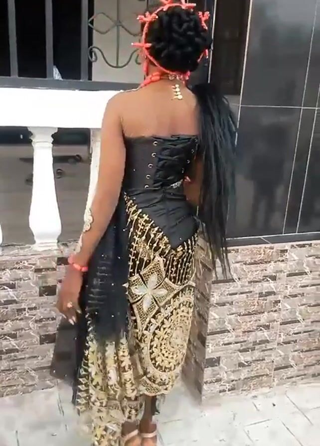 A woman in traditional Nigerian attire poses outdoors. She wears a black corset-style top with gold embroidery and a long skirt with intricate gold patterns. She has coral beads around her neck, in her hair, and on her wrists. She also holds a black feather fan. The background includes a house with white railings and dark-tiled walls. The ground is paved with light-colored tiles. The woman smiles and appears to be enjoying herself. Music is playing in the background.