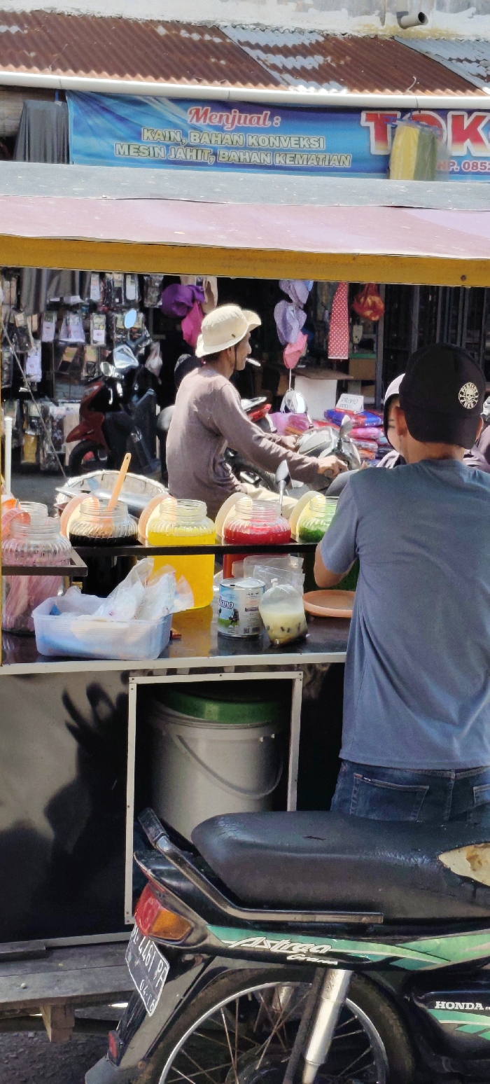The image depicts an outdoor commercial scene in Wilayah Administrasi Gp. Mns Blang Sakti, Indonesia, featuring a mobile beverage cart positioned in front of a shop. In the foreground, the rear section of a black and green Honda Astrea Grand motorcycle is visible, with a black seat. Its license plate, "BL 4461 PA," is dated "04-18." The central focus is a mobile beverage cart with a yellow frame and a black countertop. On the counter, several clear, ridged jars contain colorful liquids: pink, dark red, yellow, green, dark purple, and white. Plastic scoops are present in some jars. Other items on the counter include a blue plastic container holding multiple white plastic bags or cups, a can of Milano brand "Susu Kental Manis" (sweetened condensed milk), and a clear plastic bag containing a lumpy, off-white substance. A silver bucket with a green lid is stored in a lower compartment of the cart. Two individuals are visible near the cart. To the left, a male wearing a light-colored, wide-brimmed hat and a long-sleeved brown shirt is seated on a scooter, facing right. He has a lit cigarette in his mouth and his hands are on the scooter's handlebars. To the right, another male, seen from behind, wears a dark baseball cap with a white emblem and a blue t-shirt over blue jeans. He is positioned in front of the cart, with his hands near the counter. The background features the facade of a shop with a rusty corrugated metal roof. A blue banner above the shop entrance reads "Menjual: KAIN, BAHAN KONVEKSI, MESIN JAHIT, BAHAN KEMATIAN" (Selling: Fabric, Garment Materials, Sewing Machines, Funeral Materials) and partially visible "TOKO HP. 085...". The shop interior, visible through an open entrance, displays various merchandise including small electronic accessories (e.g., phone cases) and textiles. Several motorcycles are parked in the background, including a red scooter. Bright sunlight illuminates the scene, casting distinct shadows.