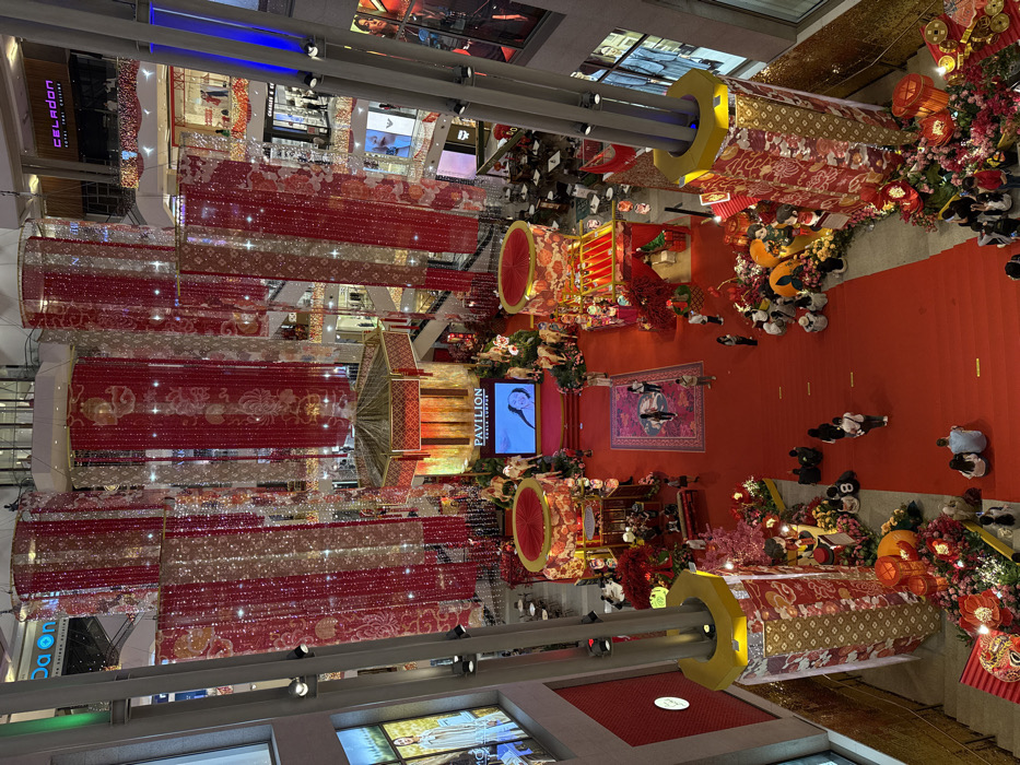 An overhead view captures the multi-story central atrium of Pavilion Kuala Lumpur shopping mall in Kuala Lumpur, Malaysia, elaborately decorated for a festive occasion. The expansive main floor is covered by a red carpet. In the central area, an octagonal, multi-tiered structure, resembling a traditional pavilion or carousel, is prominent, featuring red and gold motifs and an integrated LED screen displaying a female's face. Surrounding this central structure are numerous golden animal figurines, appearing to be oxen or sheep. From the mall's high ceilings, numerous tall, cylindrical fabric banners in red, gold, and white, adorned with traditional patterns and small lights, hang vertically. Pillars on the main floor are wrapped in matching red and gold decorative fabric. Along the red carpet and elevated platforms, various festive displays are arranged, including artificial pink cherry blossom trees, large red lanterns, oversized golden mandarin oranges, and abundant floral arrangements in shades of red, pink, and yellow. Two circular, ornate red and gold display platforms are visible on either side of the central pavilion. Multiple individuals are dispersed throughout the scene. People are observed walking on the red carpet, standing near the decorative displays, and sitting on steps or along the edges of the decor. Some individuals are visible dining at tables in restaurant or cafe areas on the surrounding lower levels. Escalators and glass railings are visible on higher floors, with numerous retail storefronts and their signage (e.g., CELADON, CHARLES & KEITH, MCM) lining the multiple levels of the mall. The environment is brightly lit with a combination of overhead mall lighting and the decorative lights of the displays.