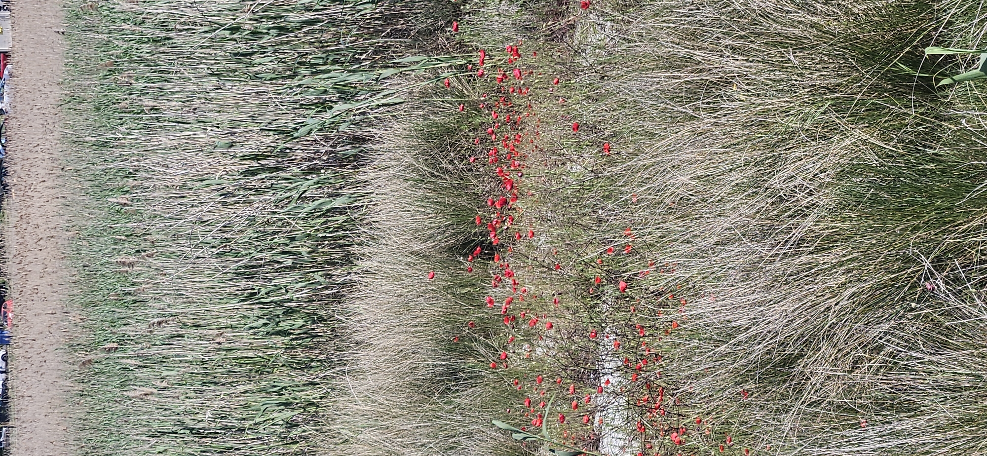 The image captures a ground-level view of vegetation in Doirani, Greece. A dense, light-brown grass occupies much of the right side of the frame. A cluster of red-flowering plants is interspersed within the grass on the center-right. To the left, a contrasting patch of greener, denser vegetation runs parallel to a beige, sandy area on the far left, suggesting a path or edge of the field. On the far left, there are a few indiscernible human-sized objects. The overall impression is one of a field or natural area with varied plant life.