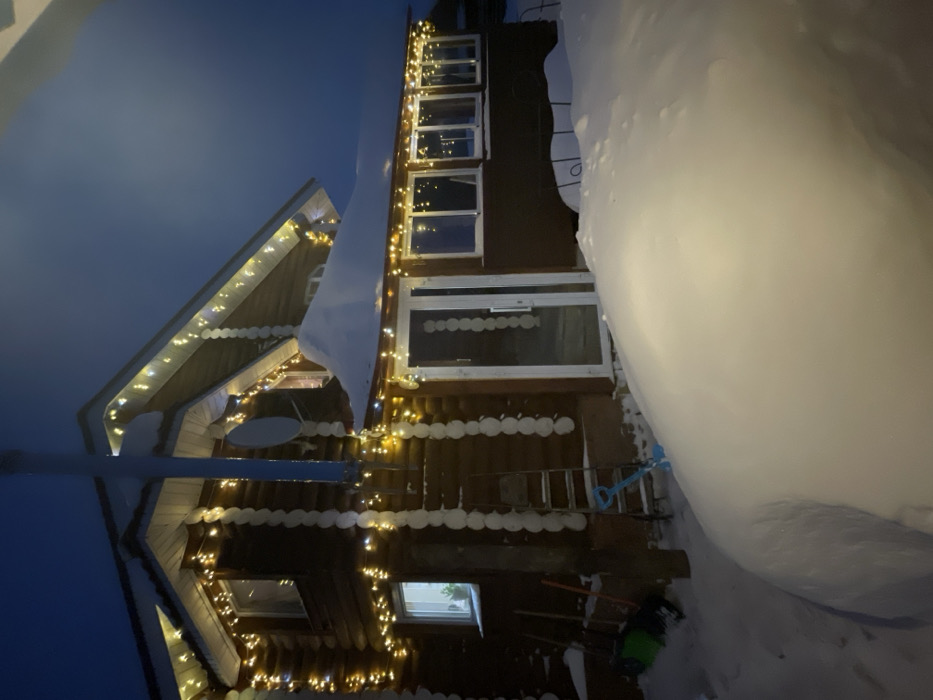 This image depicts a two-story wooden log house in Zav'yalovo, Russia, at night during winter. The house exterior is constructed from horizontal logs and is illuminated by warm white string lights draped along the eaves, the porch roof, and around various windows. A prominent metal chimney extends vertically from the roof on the left side of the structure, with a white satellite dish mounted on the log wall below and to its left. The house's roof is heavily laden with snow. A front porch or veranda, also covered in snow, features a white-framed glass-paneled entry door centrally positioned, flanked by multiple white-framed windows to its right. Interior lights are visible through some windows, casting a soft yellow glow. The ground in front of the house is covered by deep snow, forming a substantial drift in the foreground that partially obscures the lower exterior. Footprints are discernible in the snow to the right of the main drift. Leaning against the left side of the house is a metal ladder. Two snow shovels, one green and one light blue, are propped against the house's base near the ladder. A dark, possibly wrought-iron, railing or fence is partially visible protruding from the snowdrift on the right. No individuals are present in the scene.