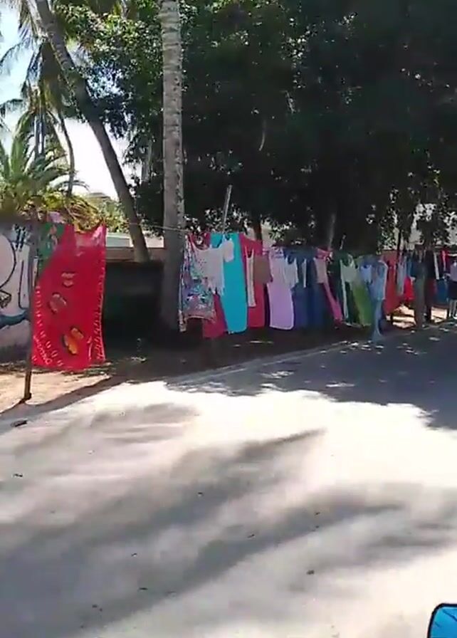 roadside display of clothing. The camera appears to be mounted on a moving vehicle, passing along a road with trees on one side. Ropes are strung between the trees, and various items of clothing are hung on the ropes, apparently for sale. Some people are standing near the clothes. The scene takes place in daylight under sunny conditions.