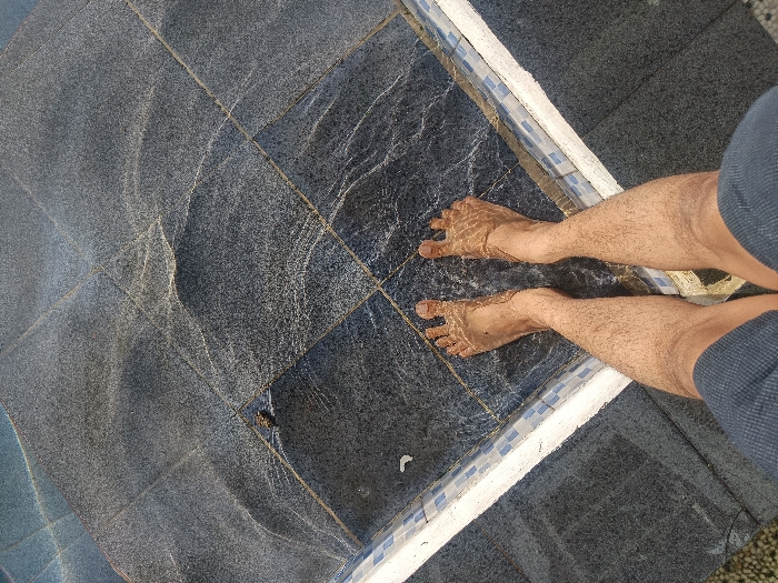 The image captures an overhead view of a person's bare lower legs and feet partially submerged in shallow, sunlit water on a tiled surface in Palasari, Indonesia