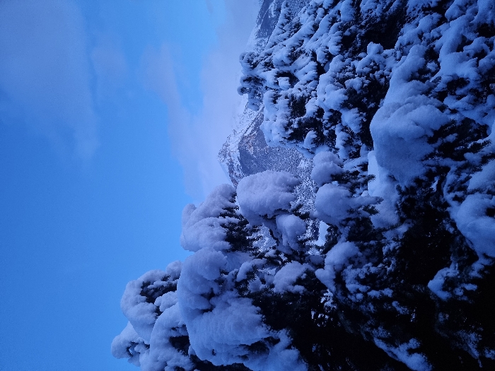 The scene depicts a winter landscape with a vibrant blue sky occupying the left side of the frame. To the right, snow-laden trees dominate the foreground, their branches heavily covered in thick, white snow. In the background, a mountain peak emerges, dusted with snow and partially obscured by clouds or mist. The lighting casts a cool, bluish hue across the entire scene, creating a serene and chilly atmosphere. The composition is oriented vertically, emphasizing the height of the trees and the mountain.