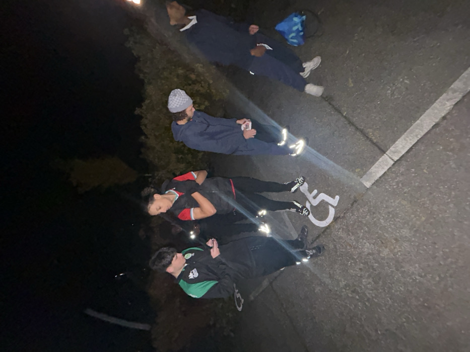 The image displays a nighttime outdoor scene on a paved surface, likely a parking area, given the presence of two distinct white International Symbol of Access (wheelchair accessible) markings painted on the ground. The location is presumed to be in Strasbourg, France, as per the request, although no specific landmarks confirming this are visible. Five individuals are present. From left to right: 1. A young male with dark hair, wearing a green and black long-sleeved athletic top and dark pants with reflective ankle stripes. He is looking down at a smartphone, which is illuminated. 2. A young person with dark, curly hair, wearing a black sleeveless vest over a red and white striped top, dark pants with reflective ankle stripes, and black and white athletic shoes. This individual stands directly on one of the wheelchair accessible symbols, with arms crossed and head turned slightly left. 3. Partially obscured behind the second individual, another person is visible, holding an illuminated object, likely a smartphone. 4. A young male with curly brown hair, wearing a grey checkered knit beanie and a dark blue hooded tracksuit with reflective elements on his pants near the ankles. He is looking downwards, possibly at a smartphone in his hands, which emits light. He stands near the second wheelchair accessible symbol. 5. On the far right, a young male with dark skin, wearing a dark baseball cap, a light-colored collared shirt under a dark blue zipped jacket, and dark blue tracksuit bottoms with reflective ankle stripes. He wears white athletic shoes and looks towards the right. A blue fabric bag rests on the ground near his feet. The ground is dark asphalt, and a white painted line runs diagonally across the lower right section of the pavement. The background is dark and indistinct, showing some dark vegetation or trees. The scene is illuminated by an unseen artificial light source, causing strong reflections on the individuals' clothing. No direct interactions between the individuals are discernible; most appear to be engaged with their phones or observing their surroundings. The exact street or specific area within Strasbourg, France, is not identifiable from the image.