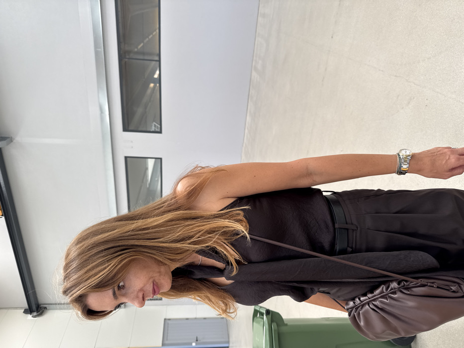 A woman with long, light brown hair, wearing a dark brown sleeveless top with a decorative draped tie and dark brown pleated trousers, stands in an indoor commercial or industrial space in Torres Vedras, Portugal