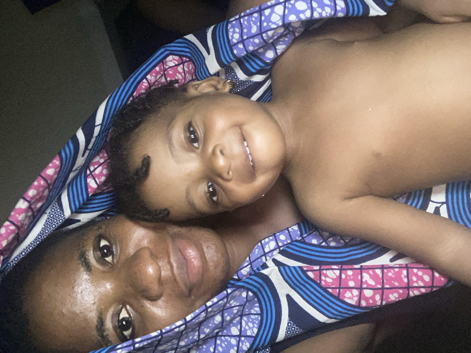 - "A woman and a child are lying together under a vibrant blue, pink, and white patterned cloth" by FM-4e3eB3, licensed under CC BY 4.0