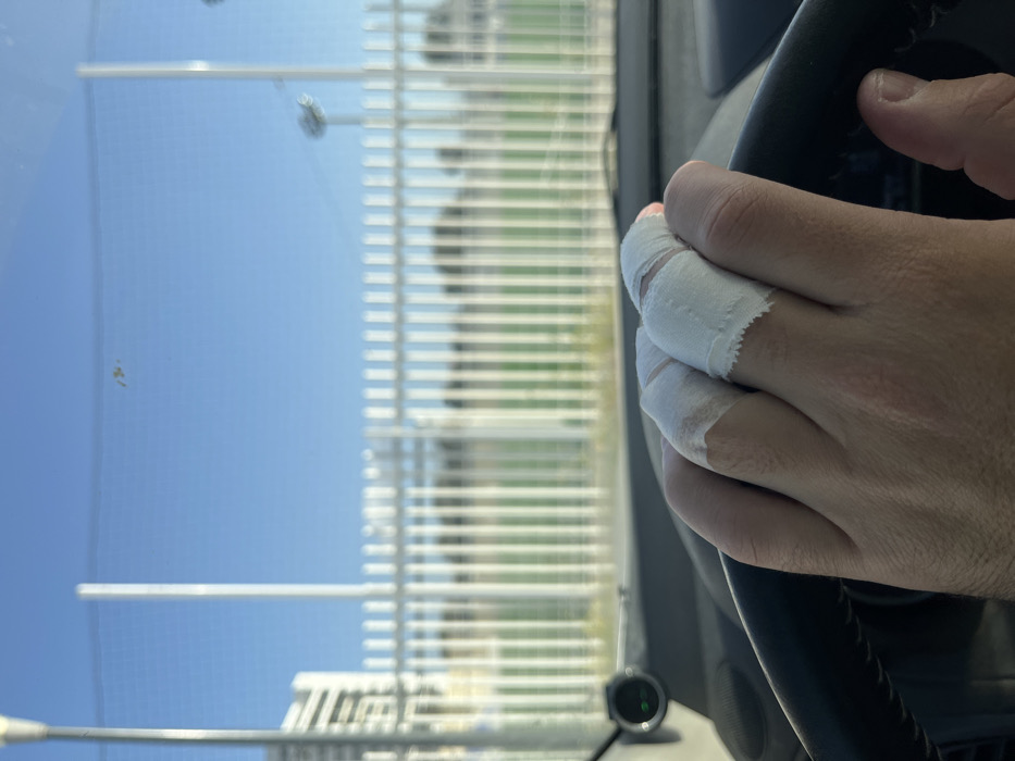 person's hand gripping the steering wheel of a vehicle. The person's two middle fingers are bandaged. The vehicle appears to be parked in front of a white fence, which is likely located in the city of Kiryat Ono, Israel, based on the provided coordinates. The location is likely a sports field. The sky is blue and there is a bright sun shining. The car is facing forward.