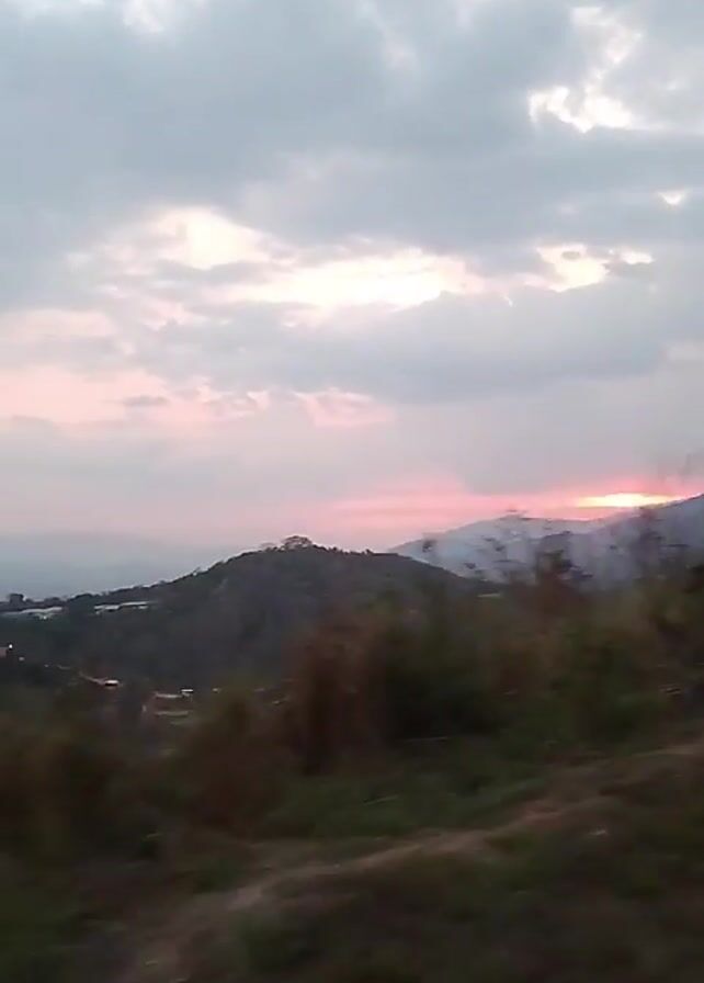 A wide-angle shot captured from a moving vehicle showcases a scenic mountain landscape at sunset. The sky is overcast with numerous clouds painted with hues of gray and pink, hinting at the setting sun on the horizon. The distant mountains appear as silhouettes, their dark forms contrasting against the colorful sky. The foreground consists of grassy terrain and low-lying vegetation. The vehicle is moving, causing the foreground to blur slightly. The overall mood is serene and scenic.