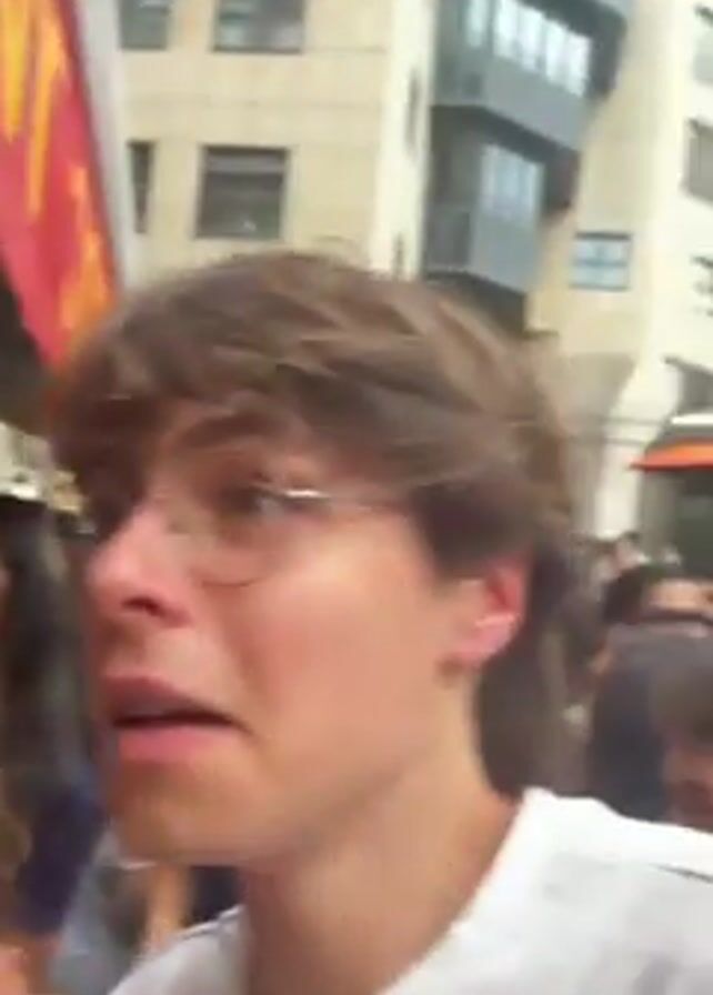 The video captures the vibrant atmosphere of an outdoor celebration. The initial scene shows a crowd of people gathered together, with some individuals appearing to dance and interact closely. The camera moves through the crowd revealing the event is taking place in a public space. Buildings line the area, and a bus can be seen in the background. The camera continues to move through the crowd, capturing people filming with their phones.