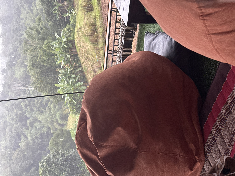 The scene is an elevated outdoor or semi-covered seating area in Ban Paem Bok, Thailand, experiencing heavy rainfall. In the foreground, a large, rust-colored fabric beanbag chair occupies the left, resting upon a patterned mat featuring red, brown, and cream colors, which is laid over artificial green turf. A dark gray square cushion is partially visible beneath the beanbag. To the right, a dark wooden table and a segment of a rope-woven outdoor seating element are present. A black metal railing with horizontal bars defines the edge of the immediate platform. Beyond the railing, a dense tropical forest covers undulating hills, with visible rain streaks indicating a heavy downpour. The vegetation includes numerous banana plants on a lower slope and a variety of green broadleaf trees, interspersed with a distinct light-colored, leafless tree in the mid-ground. A thin, dark vertical support pole extends from the upper center of the frame. No individuals are explicitly depicted.