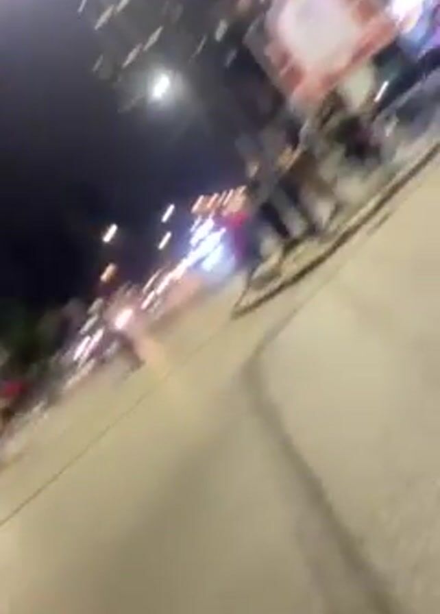 nighttime scene, likely from the perspective of someone in a car or on the street. The camera moves and stabilizes, revealing a street corner near a McDonald's restaurant, recognizable by its golden arches logo. There are palm trees in the background and several people standing or gathering on the sidewalk near the street. Vehicles, including cars and motorcycles, are present on the road, with their headlights visible. The overall atmosphere seems busy and lively, with potential pedestrian and vehicular traffic concentrated near the intersection and the fast-food restaurant.