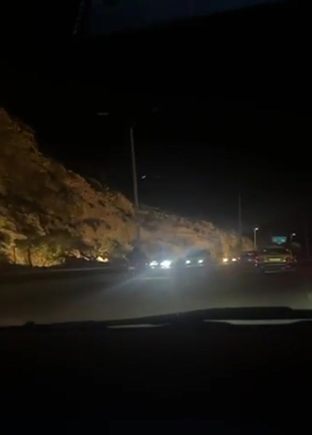 night time scene from the interior of a car driving on a road. On the left side of the road is a rocky hill illuminated by streetlights. There are multiple cars on the road in front of the camera car, moving in the same direction. A motorcycle is seen briefly between the other cars. Street lights line the road, and a small blue sign is visible on the right side. The windshield wipers of the camera car are visible at the bottom of the frame.