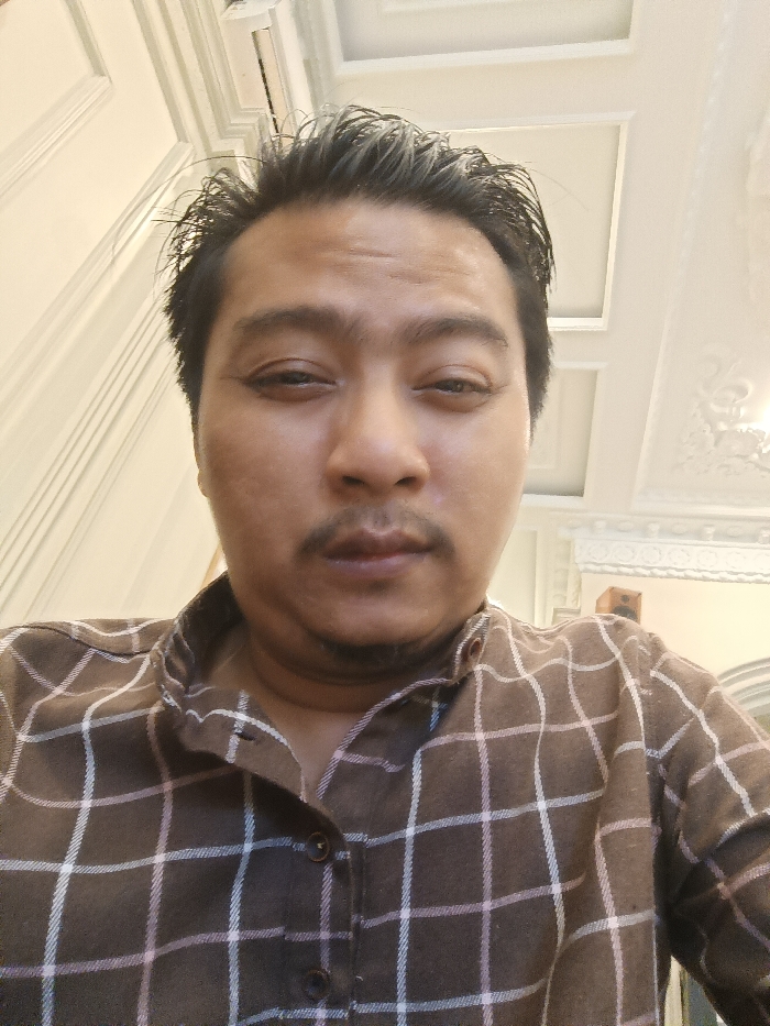 An adult male is depicted in a close-up, head-and-shoulders portrait within an indoor setting in Cianjur, Indonesia