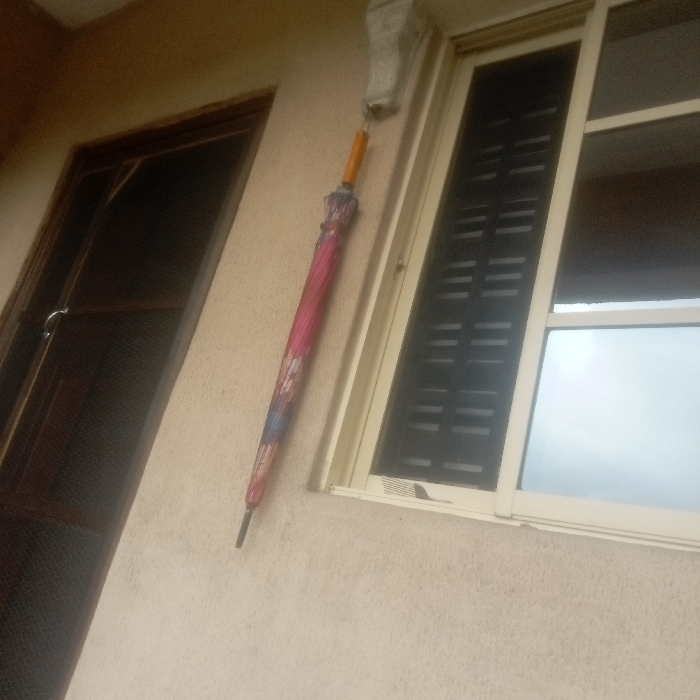 The image displays the exterior facade of a building in Elelenwo, Nigeria. A light beige, textured wall forms the primary background. On the left, a dark-framed door with a dark screen panel and a silver handle is partially visible. To the right, a white-framed window features a left pane with internal dark horizontal louvers and a right pane reflecting an overcast sky. A closed, multi-colored umbrella, exhibiting pink, blue, and purple patterns and a light brown wooden handle, hangs vertically against the wall, suspended below a small, white, wall-mounted drainage pipe. No individuals, animals, or active events are present in the scene.