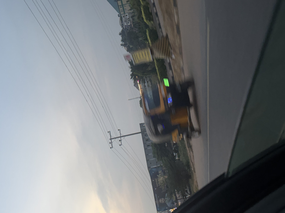 A blurred auto rickshaw travels on a road alongside a sidewalk with striped barriers. Overhead, power lines stretch across a bright, overcast sky. A pole supports the lines. Buildings and foliage line the road. The view is taken from inside a car, with a portion of the dashboard and side window visible in the lower right corner. The image has a slight tilt.