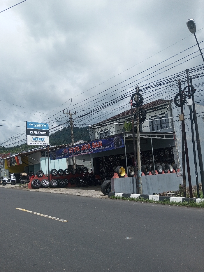 A tire shop named "Syifa Jaya Ban" displays various tires and rims along the front of its building. A banner with the store's name hangs above the entrance. Multiple power lines run across the sky. The shop is located along a paved road with a yellow line. Across the street, a utility pole and street light stand tall. The sky is overcast with a backdrop of distant mountains.