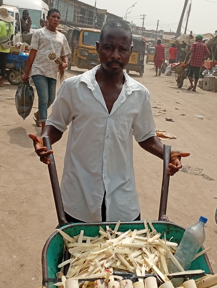 - "A man stands in a bustling outdoor market, holding a green wheelbarrow filled with peeled sugar cane and a water bottle" by FM-Z9JhE2, licensed under CC BY 4.0