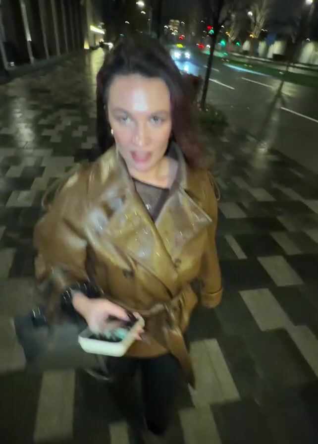 A woman with long brown hair is walking down a city sidewalk at night. She is wearing a shiny brown leather jacket, black pants, and carrying a small gray purse. She is also holding a smartphone in her hand and looking at the camera. The sidewalk is made of patterned square stones. The street is visible on the right, with cars and streetlights. The weather seems wet, as the pavement appears damp and reflective.