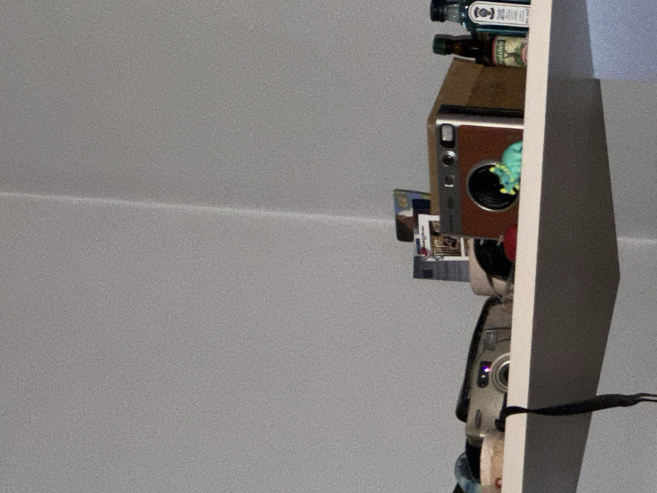 The image displays an interior scene, focusing on a white shelf against a plain, light grey wall. A subtle vertical seam or corner is visible on the wall towards the right side of the upper background. On the shelf, arranged from left to right, are several objects: 1. An irregularly shaped, light-colored fabric or cloth object. 2. A silver-toned compact film camera, featuring a prominent purple indicator light. A black strap hangs vertically from its left side, extending downwards beyond the shelf's edge. 3. Behind the cameras, several small, rectangular items, possibly postcards or small photographs, lean against the wall, partially obscured. 4. A brown-bodied camera with a silver front and a dark, prominent lens, standing upright. A small, light-blue or teal dinosaur figurine with yellow accents is positioned directly in front of this camera's lens opening. 5. A small, light-brown cardboard box is situated behind the brown camera. 6. Two miniature glass bottles are placed on the far right: a dark green bottle with a white label, bearing partially legible text that appears to be "Jagdstolz," and a clear or frosted blue bottle with a white label, showing "BOMBAY" partially visible. No individuals, actions, or direct interactions are depicted. The lighting is uniform and ambient. The specific location within Yerevan, Armenia, is not identifiable from the image's content.