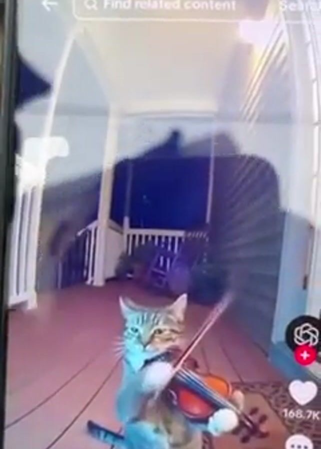 A hand holds a smartphone, displaying a TikTok video featuring a cartoon cat playing a violin
