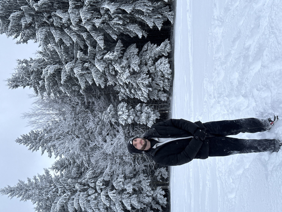 A male subject stands in a snow-covered field in Le Hohwald, France