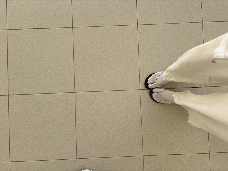 The image displays an overhead perspective of a person's lower legs and feet, positioned on a light beige tiled floor within the city of Chablekal, Mexico. The individual is wearing off-white, opaque split-toe socks beneath dark brown flip-flops with slender, metallic gold-colored toe straps. Light-colored trousers or pants, likely white or cream, are visible at the ankles, falling loosely over the feet. The floor consists of uniformly sized square ceramic tiles, separated by dark grout lines, and exhibits a matte finish with minor surface specks. No other subjects, objects, or environmental context are visible beyond the immediate ground and the person's lower extremities. The person appears stationary.