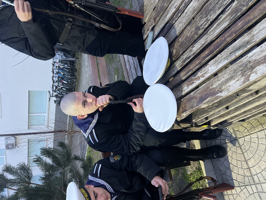 The image depicts three male individuals in naval uniforms in an outdoor setting at the Bulgarian Naval Academy "N