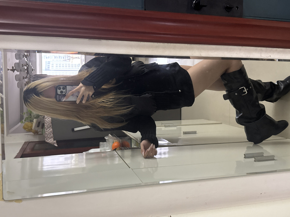 A person is depicted taking a mirror selfie in an indoor residential setting, located in what is stated to be Shapingba District, China, though specific identifying landmarks for that district are not visible. The individual, whose face is partially obscured by a smartphone, possesses long, light brown hair with darker roots. They are wearing a black puffer-style jacket with ribbed cuffs and hem, a dark skirt or shorts, and tall black boots with buckle details. The left hand rests on a white, multi-paneled cabinet. The right leg is raised and extended forward, showcasing the boot. The reflection in the mirror reveals a background consisting of white cabinets, a countertop holding clear glass with orange fruit in a white bag, and a dark refrigerator or cabinet. Further back, a window displays a view of urban high-rise buildings and a multi-bulb chandelier or light fixture. The floor appears to be light-colored tile or laminate. To the immediate right of the mirror, a reddish-brown door frame with a black door handle and lock mechanism is visible. The mirror itself exhibits minor discoloration along its upper edge. The subject's smartphone, held in the right hand, features a black and white patterned case.