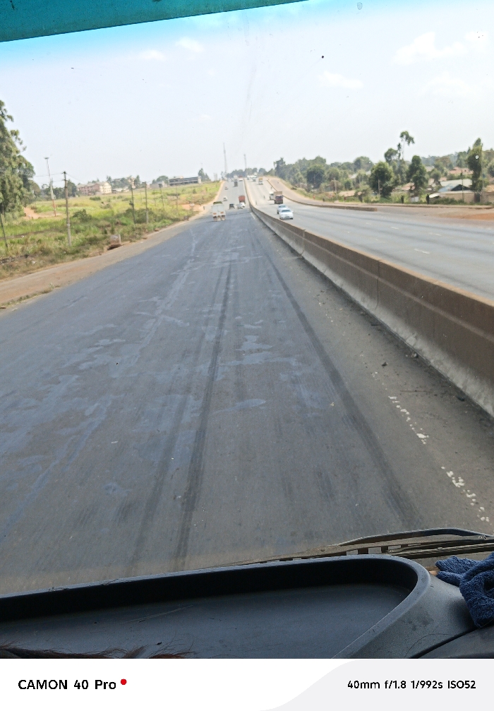 A long, straight road stretches into the distance, marked by tire tracks. A barrier separates the road from another higher road to the right, where cars are driving. The view is captured from inside a vehicle, with part of the dashboard visible. Greenery and buildings line the sides of the road. The sky is bright, suggesting a clear day.