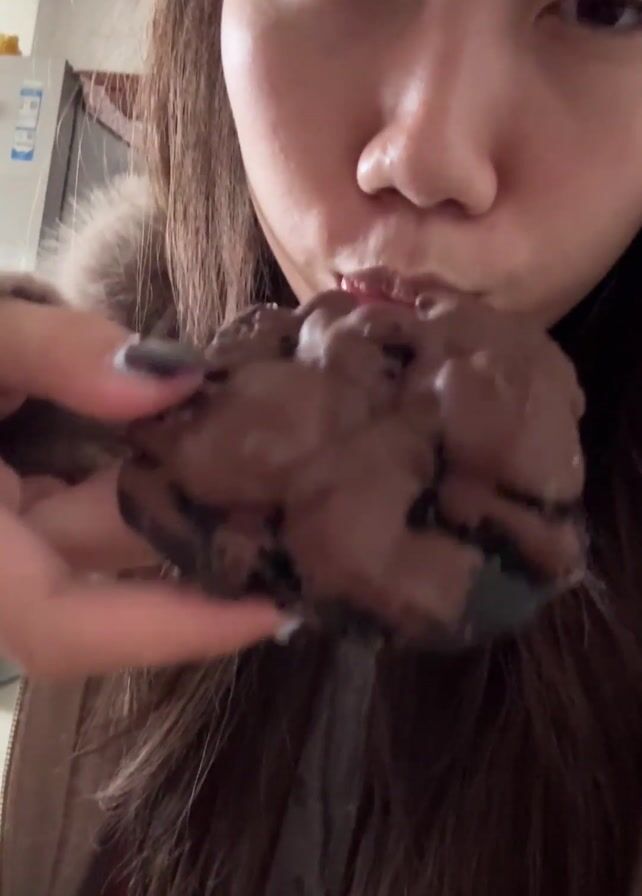 A young Asian woman is holding a chocolate baked good up to her face, bringing it to her lips but not eating it. She is wearing a beige jacket with faux fur around the collar. Her dark hair is loose around her shoulders. Her nails are painted dark. The background is blurry, showing a refrigerator and other objects.