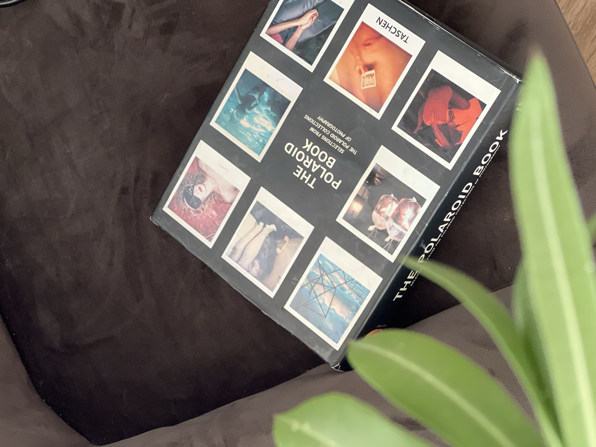 The image depicts a large, dark-colored book titled "THE POLAROID BOOK SELECTIONS FROM THE POLAROID COLLECTIONS OF PHOTOGRAPHY," published by TASCHEN, resting on a dark brown, possibly fabric, upholstered surface, likely a sofa or armchair