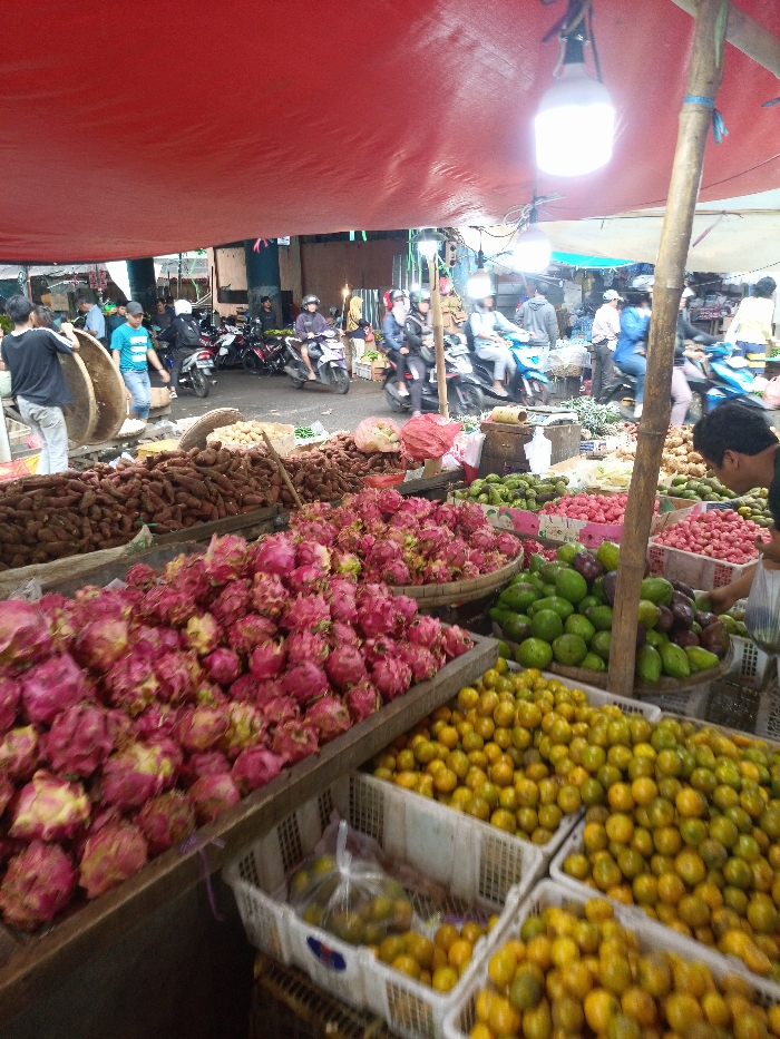 A bustling market scene under a red awning shows various fruits and vegetables displayed for sale. Dragon fruit, oranges, green avocados, and small red berries are prominently featured. In the background, people walk and ride scooters, creating a vibrant atmosphere. A vendor is seen examining a selection of berries. The market is well-lit by hanging bulbs.
