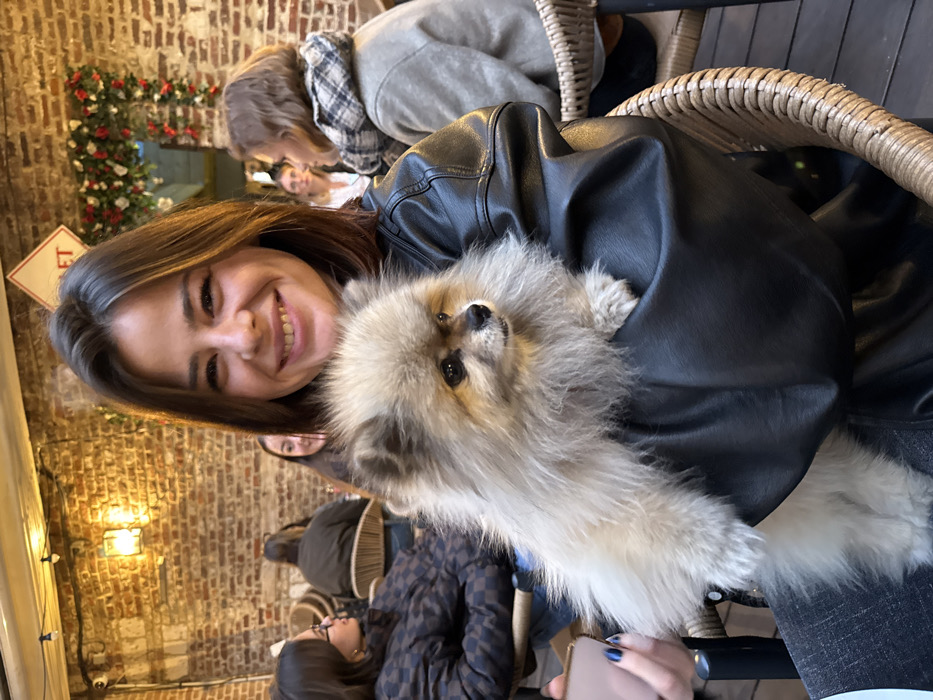 A young adult female, with brown hair and light skin, smiles directly at the camera while holding a small, fluffy, light brown Pomeranian dog in a casual outdoor or semi-enclosed setting