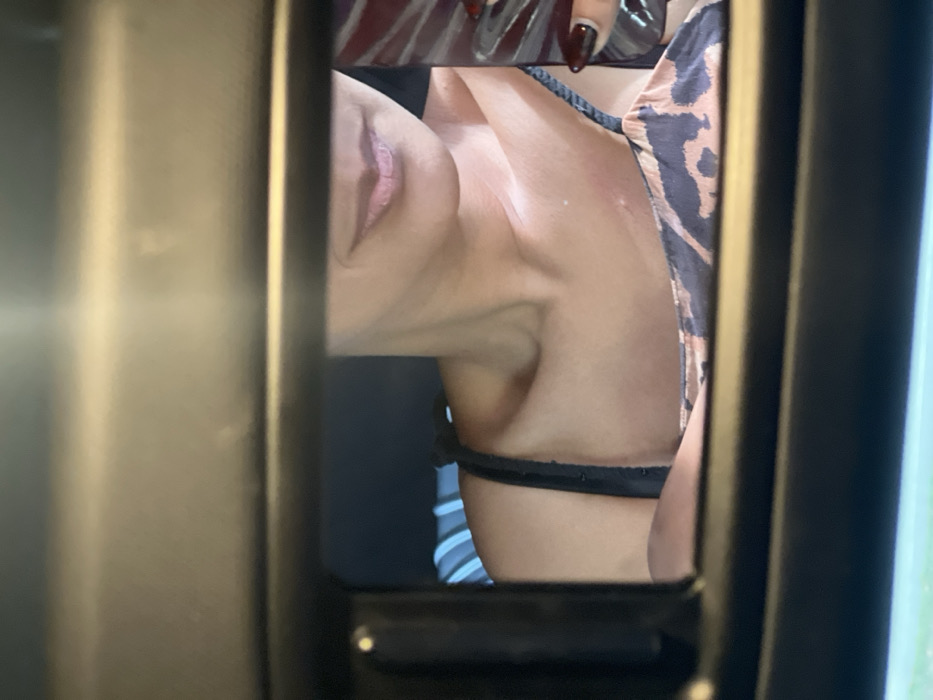 A close-up shot, partially framed, captures the upper body of a person. The individual wears a patterned top with thin straps and has manicured nails. The side of their face is visible, featuring a portion of their lips. The image appears to be a reflection in a dark, metallic surface, possibly a vehicle mirror or window frame. The overall composition is unconventional and focuses on a limited section of the subject.