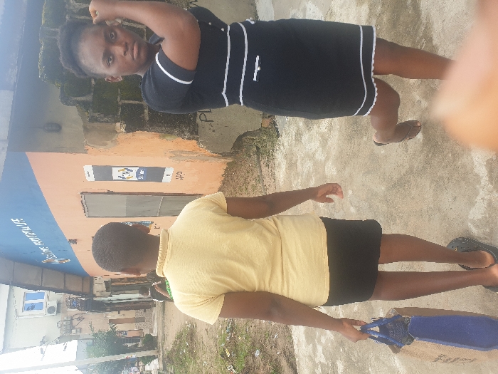 The scene depicts two individuals on a paved surface in Umuode, Nigeria, with buildings and a street in the background. In the foreground, a person, possibly a young female, is seen from behind, walking to the left. This individual wears a yellow short-sleeve collared shirt, a black mini-skirt, and dark sandals. They carry a brown and blue reusable shopping bag in their left hand. To their right, in the mid-ground, another person, appearing to be a young female, faces the camera. She has dark hair styled up and wears a black short-sleeve top with three white horizontal stripes across the chest and a black skirt with two white horizontal stripes near the hem, and a small white detail near the left hip pocket. She wears dark flip-flops and looks directly at the camera with a neutral expression, her left arm slightly bent. The immediate background on the right features a single-story building with a light orange lower section and a blue upper section. White text on the blue section reads "...GOSPEL OF ETERNAL LIFE". A dark door is visible on the orange wall, which also features a painted graphic of a smartphone displaying an interface with "GHT" or "CH". The building's rightmost section consists of exposed gray concrete blocks with some green growth, and "PL" is graffitied on it. To the left, behind the first individual, a dirt path parallels the paved area, leading towards a multi-story, light-colored building with a blue-framed window and an external air conditioning unit. Minimal vegetation is visible on the far left. The ground is a light gray paved surface.