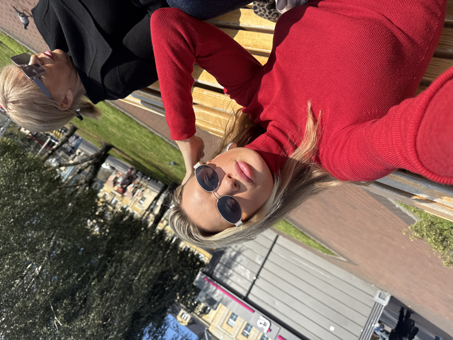 Two females are seated on a wooden slatted park bench outdoors on a sunny day in Kaliningrad, Russia. The foreground subject, a young woman with blonde hair and highlights, is taking a selfie, looking directly into the camera. She wears a red ribbed turtleneck sweater, silver-framed oval sunglasses, and large silver hoop earrings. Her left hand is raised, touching the side of her head near her ear. To her right, an older woman with short blonde hair and large square dark sunglasses is seated, looking towards the right side of the frame, away from the camera. She wears a dark, possibly black, collared coat. A leopard-print item is partially visible next to her. Behind the subjects, the environment consists of a wide paved pedestrian area with reddish-brown pavers, followed by a strip of green grass, and then a roadway with blurry vehicles. Multi-story buildings are visible across the street, featuring light-colored facades, some with ornate details. A prominent sign with a pink and grey "T" logo is visible on a building to the far left. Large, mature trees with green foliage line the street and park area. The strong sunlight indicates a clear day, casting distinct shadows.