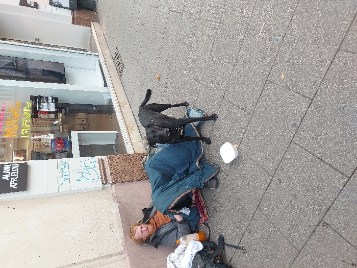 This image depicts a street scene in front of the Alain Afflelou optician store at 3 Place Kléber, Strasbourg, France. A Caucasian adult male with reddish-brown hair and beard is seated on the grey rectangular-paved sidewalk, leaning against the light beige lower facade of the building. He wears a dark jacket over an orange shirt and is partially covered by a blue sleeping bag, which rests on a red patterned mat. To his left, a dark backpack, a clear plastic bottle containing an orange liquid, and a white crumpled item are visible. Standing directly in front of the seated man is a medium-sized, black, short-haired dog, possibly a Labrador mix, wearing a dark harness. The dog is looking directly towards the camera. On the sidewalk in front of the dog, a white plastic container, appearing to be a food bowl or collection box, is present. Further to the right on the sidewalk, a small, spherical orange object is visible, along with scattered brown leaves. The building's facade features a dark brown granite base and a light beige upper section with light blue graffiti markings. Above the large shop window, a black sign displays "ALAIN AFFLELOU" in white text. The shop window interior shows "MAGIC" in luminous text and various optical products. A metal grate is embedded in the sidewalk near the building's base to the right.